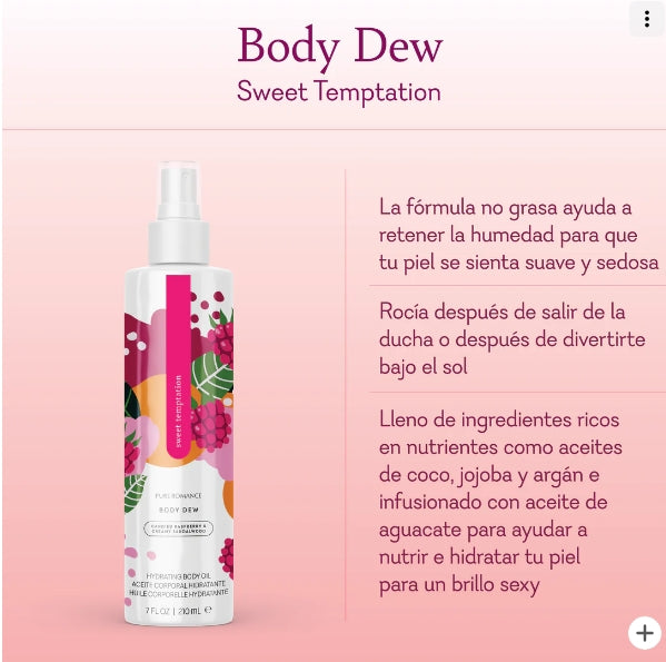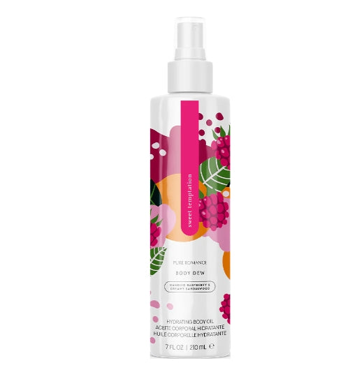 Mírame brilla en una botella, el aceite corporal hidratante mantiene la piel flexible y seductora del día a la noche. Con una mezcla de ingredientes que cuidan la piel, incluido el aceite de semilla de jojoba, este suave humectante puede incluso ayudar a mantener tu arte corporal con un aspecto fresco. Ponte este aceite corporal hidratante después de una ducha o después de divertirte bajo el sol para una explosión de hidratación que dejará cada centímetro de tu piel con una sensación suave y sedosa. Sweet Temptation es una deliciosa mezcla de frambuesas confitadas, sándalo cremoso y mandarina dulce.